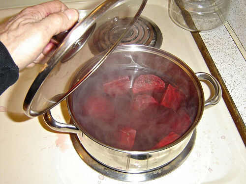 Cuarto dos remolachas peladas, añadir a un cuarto de galón de agua y hervir. Añadir especias al gusto, como verduras sal, albahaca, orégano, pimentón, ceyanne, salsa picante, pimientos rojos... algo rojo y caliente es juego justo!