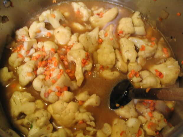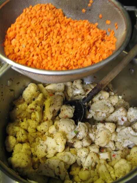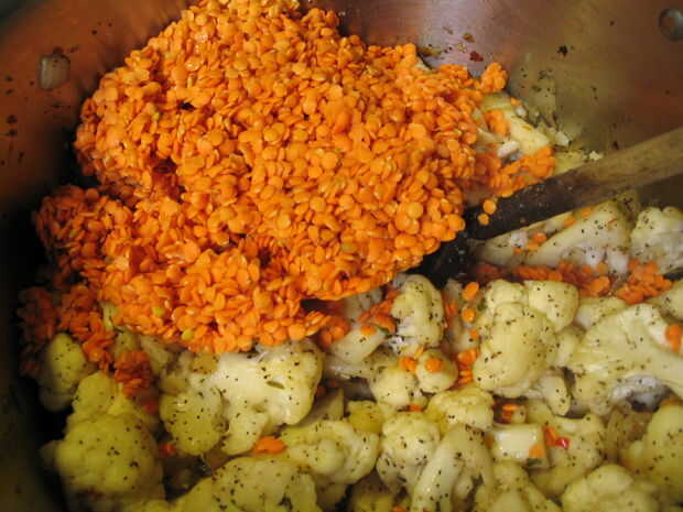 Lavar, escurrir y agregar las lentejas rojas. Revuélvalos a recoger el aceite y condimentos. Esta receta utiliza lentejas rojas dado que se cocinan rápidamente, mucho más rápido que los guisantes o muchas otras opciones. Giran amarillos sobre cocina.