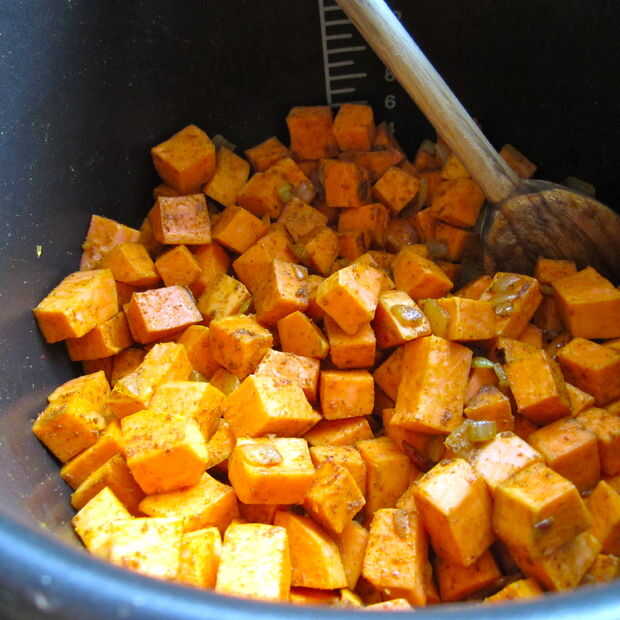 Pelar las batatas y luego cortarlas en trozos pequeños. Como cortarlas, echan en la olla con la cebolla y las especias y revuelva. Continúe hasta que las patatas en la olla y cubren con las especias.
