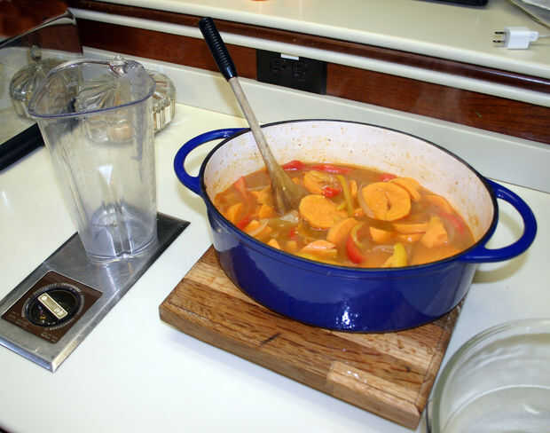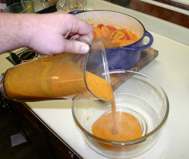 Para aquellos de nosotros con los mezcladores tradicionales, usted necesitará transferir la sopa a la licuadora, teniendo cuidado de no salpicar como caen las verduras en el caldo. En mi licuadora tiene garrafas de dos y una mitad de puré-ing para procesar todo el lote a través de su semi transformación mágica de sopa a la sopa de mariscos, así que agarra un recipiente que sirve para transferir el bisque en proceso.