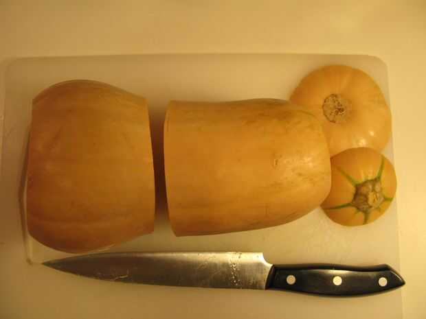 Cortar los extremos de la calabaza y cortar la calabaza por la mitad.