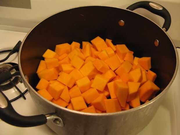 Picamos los 4 trozos de calabaza en cubos de tamaño de la pulgada y añadir la calabaza en cubos a la olla de sopa.