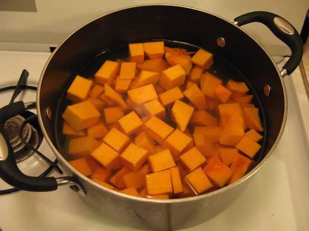 Cubrir la olla, encender el quemador de alta y hervir, luego reducir el calor y cocinar a fuego lento hasta que la calabaza puede ser ensartada fácilmente con un tenedor.
