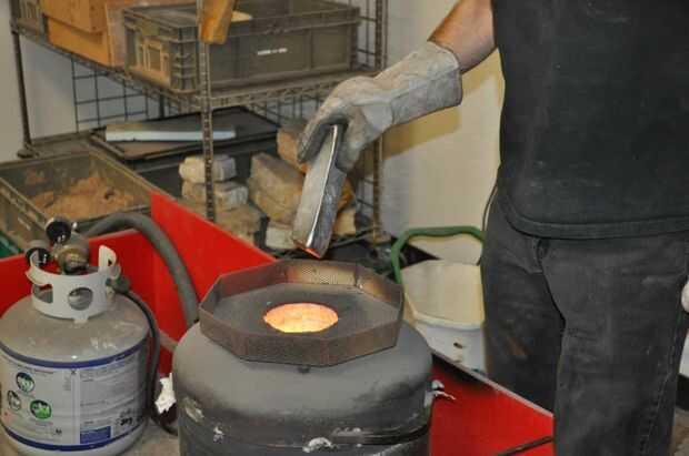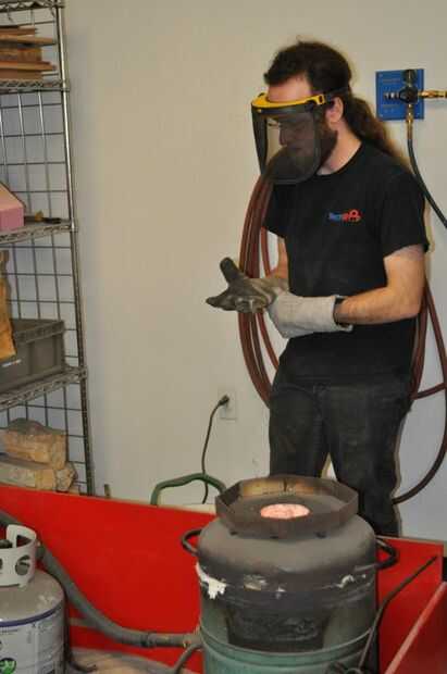 Para nuestro pour utilizamos aluminio ya que es fácil trabajar con y manejar, se puede utilizar algo más. Una vez que el horno estaba caliente, Evan caído simplemente en nuestro bar de stock y le permitió a derretir. Vaya a Evan!
