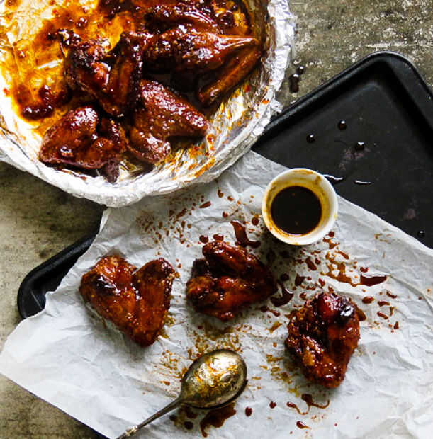 Añadir unas cucharadas de aceite en una bandeja para hornear, coloque las alas de pollo, también puede cubrir la bandeja con papel de aluminio, aceite y hornear en horno precalentado a 200 grados Celsius durante al menos treinta minutos, voltee las alas y cocinar de 15 a 20 minutos. Tenga en cuenta que estoy usando un horno de convección y a veces encontrar la necesidad de cocinar unos minutos más o hasta que estén cocinadas bien. Una vez cocidas las alitas de pollo, verter la salsa encima y mezclar hasta que están bien cubiertas.