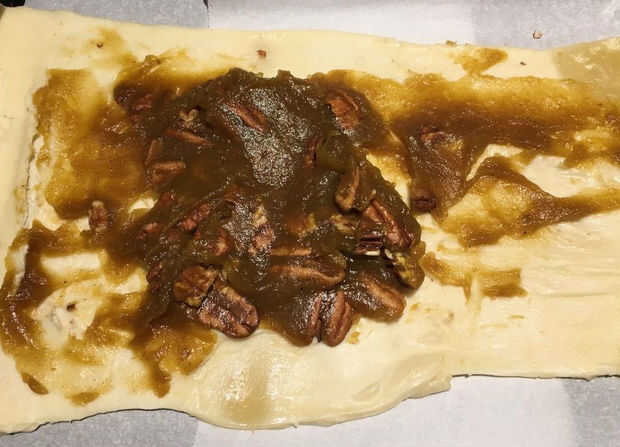 Estirar la masa de hojaldre y espolvorea nueces picadas en el centro, en círculo/forma de emparejar su brie. Luego untar mantequilla de calabaza sobre las nueces y la masa. La calabaza mantequilla que utilicé es de una receta anterior de la mina.