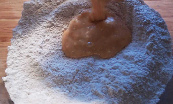 Una vez completamente se revuelve los ingredientes húmedos, seguir adelante y volcar sobre los ingredientes secos. Sin embargo, asegúrese de que volcar en un poco primero, revolvery volcar luego en el resto. Ver video sobre para la demostración completa.