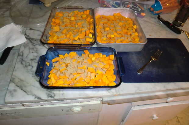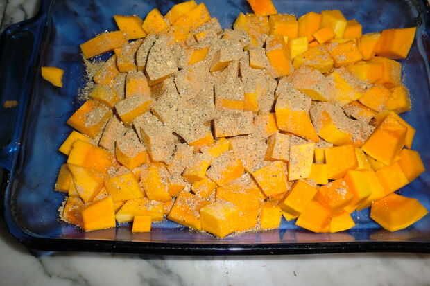 espolvorear esta mezcla sobre los cubos de calabaza.