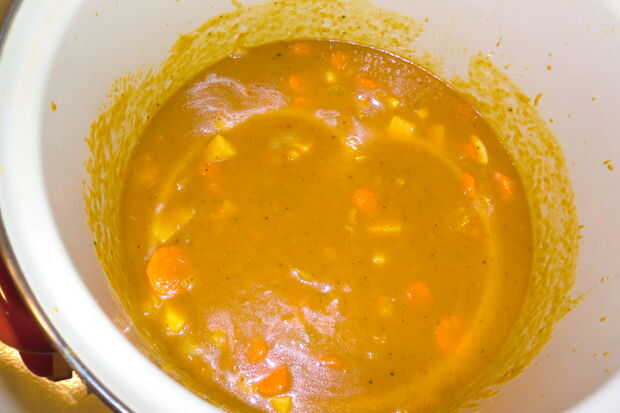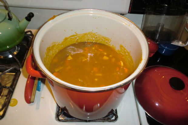 ahora mezcle todas las calabazas, papas y zanahorias a su vez el calor hasta Haz hervir un poco de la sopa. reducir y cocinar a fuego lento.  no te olvides de revolver la sopa y tenga cuidado de no salpicar a cualquiera en sus nudillos, podría herir un poco. (o ya con un pequeño segundo grado quemadura)