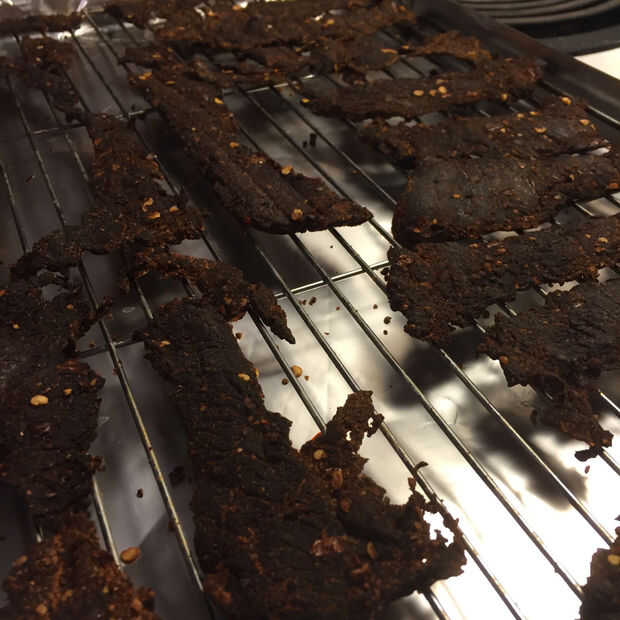 Ahora que ha marinado la carne durante 2 horas y toda la humedad adicional de la marinada ha sido quitado de su tiempo para colocar las rebanadas en un espacio y un estante de enfriamiento en un horno precalentado a 175 grados. A continuación coloque una bandeja de goteo o trate de hornear debajo de la carne en el siguiente abajo apenas nada se cae durante el proceso de secado en caso.