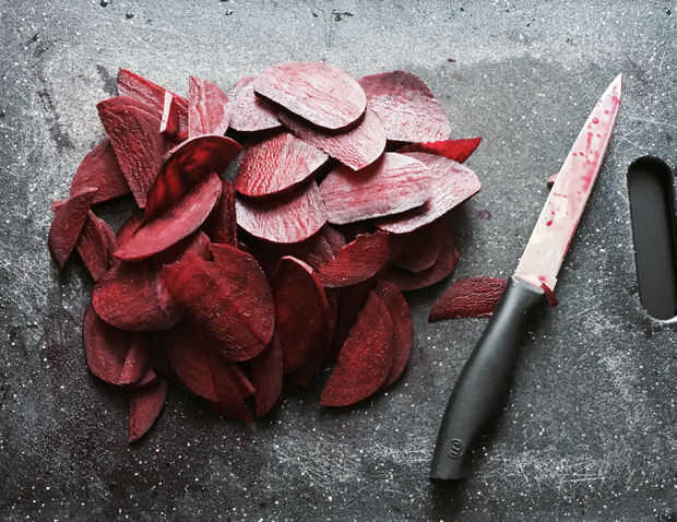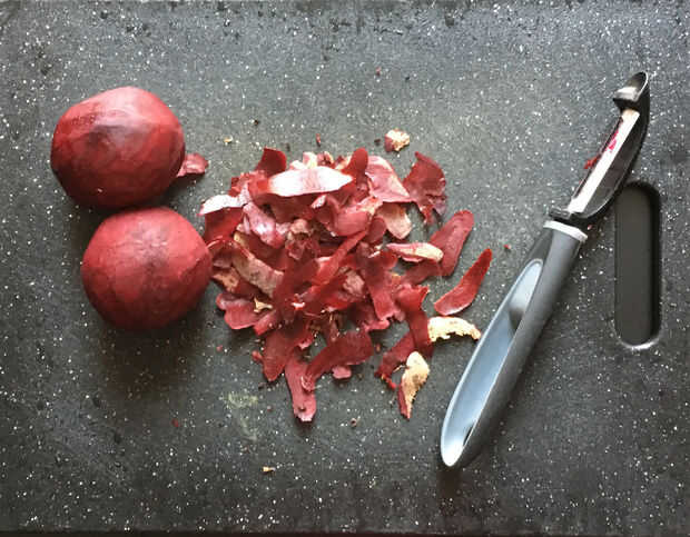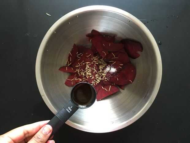 2) utilizando un cuchillo afilado o mandolina o máquina de cortar, cortar la remolacha en rodajas finas. Trate de mantener los cortes incluso.