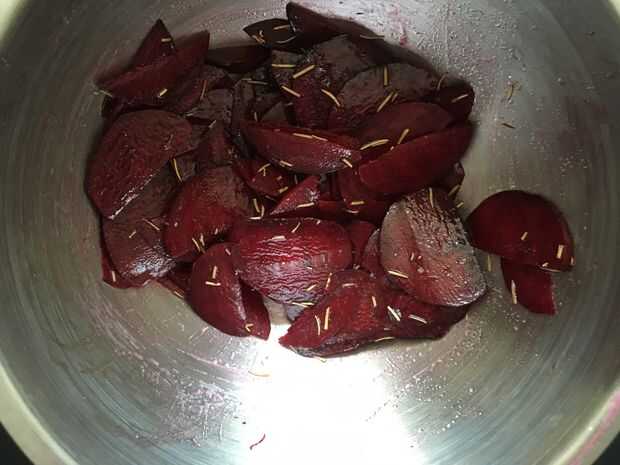 3) en un bol agregar las remolachas en rodajas junto con el aceite de oliva, romero seco, sal de ajo y mezcla bien.