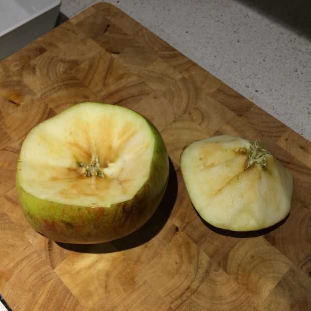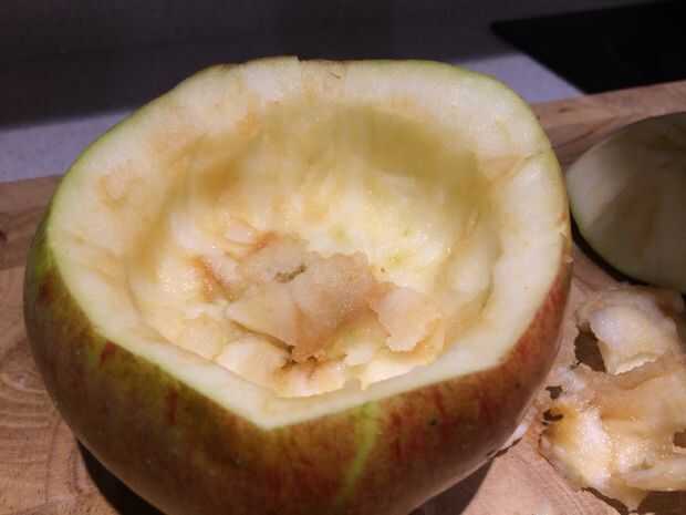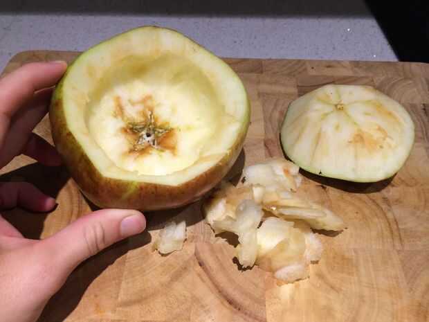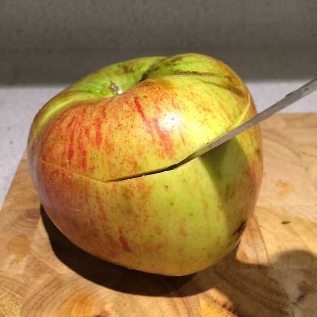 Con cuidado corte la 'tapa' de la manzana utilizando un cuchillo afilado en un ángulo - tu mejor técnica de calabaza tapa pagará muy bien aquí! Después ha cortado todo el camino alrededor, cuidadosamente tome el cuchillo alrededor para un segundo paso, esta vez cortando en más hacia el centro hasta que la tapa salga. Con algunas manzanas obstinados, que tendrás que levante la tapa con los dedos.