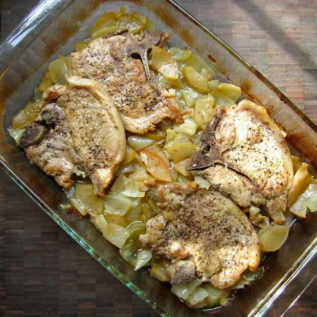 No necesita mezclas estas chuletas de cerdo o cualquier fritura en todos, y salgan tierna y deliciosa cada vez! También hacen su propia salsa, y las manzanas y las cebollas resultan agradable y suave de ser cocido al horno tanto tiempo.
