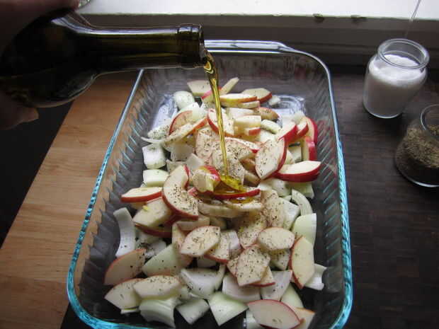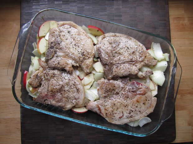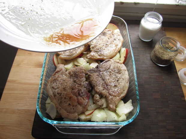 Coloque las chuletas en la parte superior. Su placa de descanso debe haberse acumulado una buena cantidad de jugos deliciosos en este punto, así que vierte sobre la parte superior.