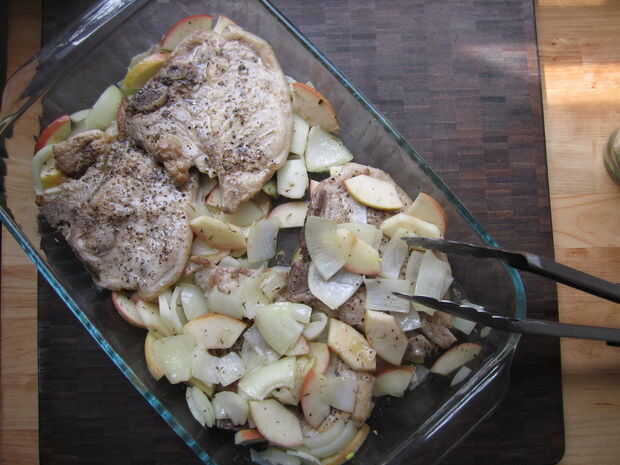 Una vez que ha pasado media hora, sacar la bandeja y enterrar las chuletas en las manzanas y las cebollas. Las cebollas y las manzanas tendrá suaves en este punto, y algo de líquido se acumula en la bandeja. Enterrar las chuletas mantendrá la carne húmeda.