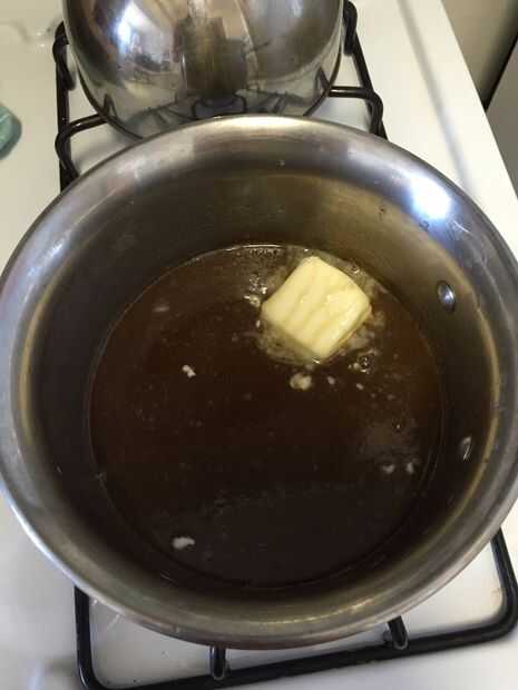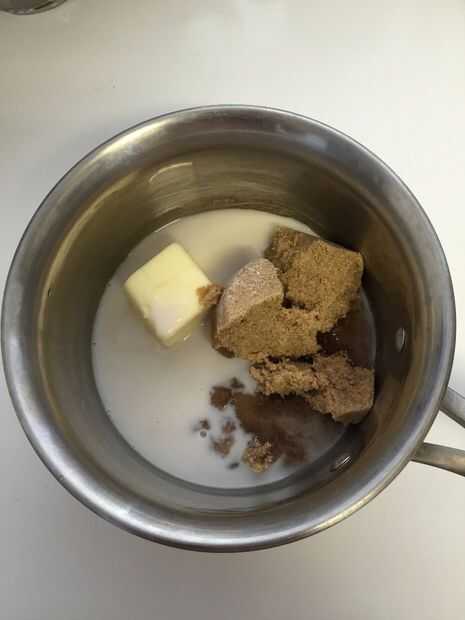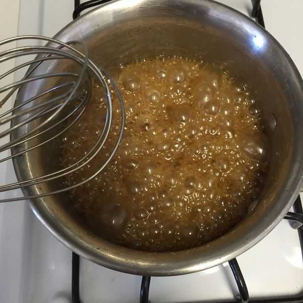 En una cacerola tamaño mediana sobre fuego medio alto haga hervir todos los ingredientes de la salsa de caramelo.