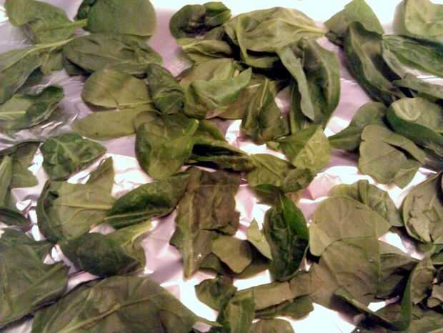 Difundir un puñado grande de espinacas hacia fuera en la hoja de galleta. Puede ser aseado y asegúrese de que todas las piezas no se tocan, pero no lo hice. Las virutas pegan algunas, pero honestamente no me importaba. Espolvorea tu aderezo de preferencia en las espinacas. Hacer este con moderación... un poco va un largo camino, especialmente con sal.