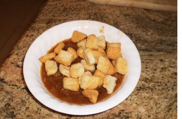 -Ahora con nuestra deliciosa sopa de cebolla francesa, vierte un poco de sopa de cebolla francesa caliente en un tazón.