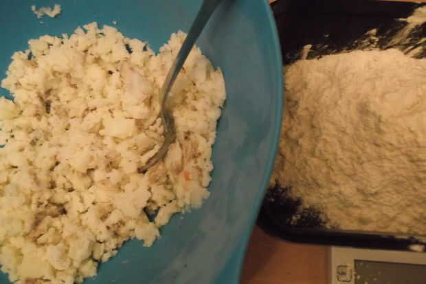 1. juntar todos los ingredientes en un bol grande y poner junto con las manos para formar una masa suave. Tenga cuidado al añadir la harina, como es posible que necesite un poco más o menos dependiendo de la humedad de las papas.