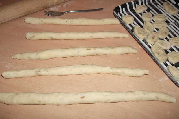 4. corte en 1,5 cm de ancho luego calabaza con un tenedor para dejar una marca de los dientes del tenedor - esto ayuda a la salsa se adhieren a los ñoquis.