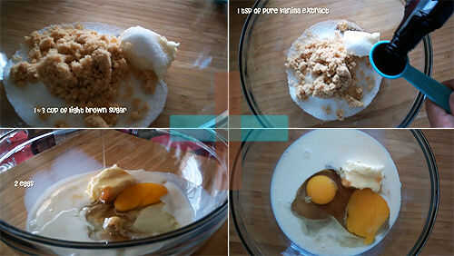 Ahora, en un bol grande añadir 3 cucharadas de temperatura mantequilla, 1/3 taza de Azúcar granulada, 1/3 taza de azúcar Light, 1 cucharadita de Extracto puro de vainilla, 1/2 taza de lechey 2 huevos. [ boca ]