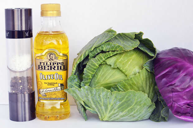Cepillar los lados de cada rebanada de col con aceite de oliva o ghee