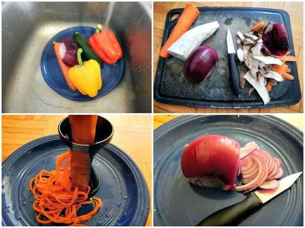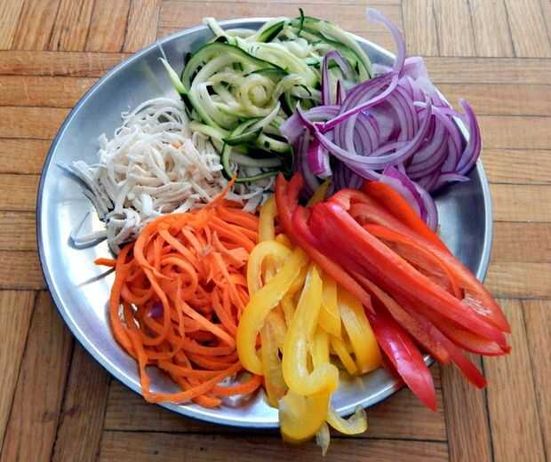 Utilicé la máquina de cortar espiral para cortar cuchillo para rebanar la cebolla, pimientos, calabacín, tapioca y zanahoria.