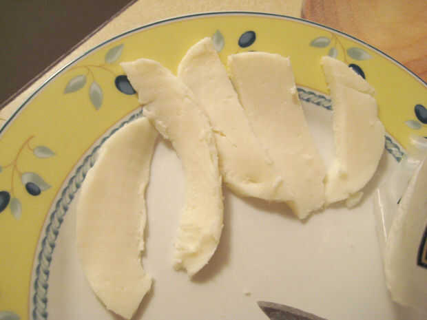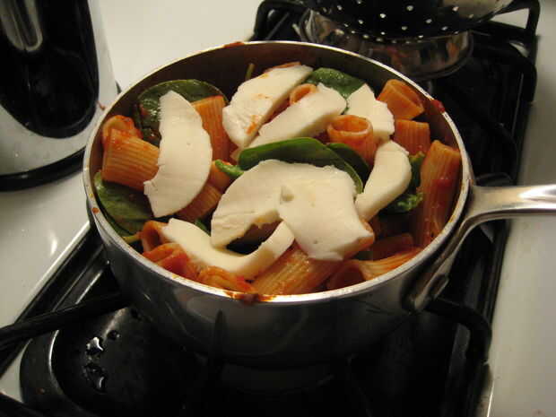 Corte unos 10 rebanadas de queso mozzarella y colocar encima la pasta.