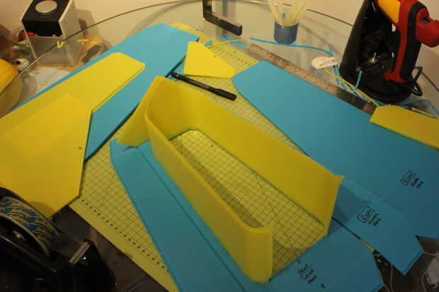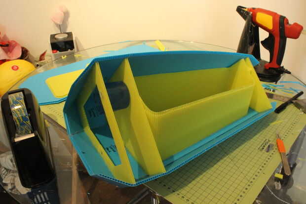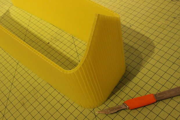 Aplique pegamento hacia abajo de las costuras internas. Es donde realmente ayudar las articulaciones de encaje/descuento a lo largo de toda la superficie, ya que no sólo permiten que las superficies se unan perfectamente, pero también para permitir una mayor superficie para el pegamento adherir a. (Me sorprendió lo bien esta obra y las uniones son muy fuertes - probarlo en algún desecho Correx para comparar con un estándar 'empalme').