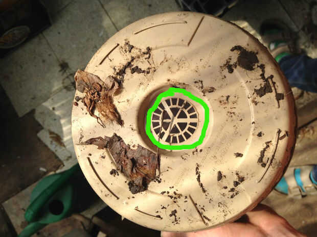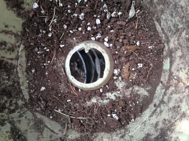 Use sus tijeras un cuchillo para cortar el círculo de plástico en la parte inferior de la maceta