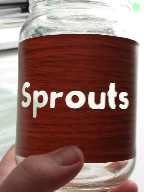 Lavar y secar completamente el frasco. Pelar su plantilla fuera de la almohadilla de corte y adherirse a su tarro. Retire los pedazos de centro de las letras "p" y "o" y adherir en la posición correcta. Asegúrese de que la plantilla se pega bien y que no hay ninguna burbuja de aire.
