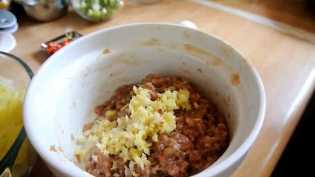 Una vez que la col napa, mezcla jengibre picado y ajo en carne de cerdo adobada.
