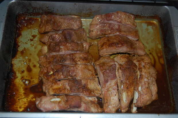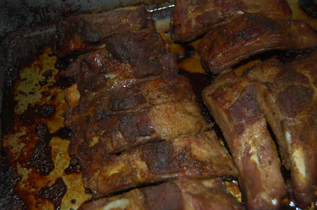 Cuando baje el horno, también corte un escape de vapor pequeña en la parte superior de la hoja, o quitar la tapa parcialmente. Esto evitará que las costillas que empapado - la idea es a los de vapor para que la carne es jugosa y tierna, pero no a remójelos. Una vez que el calor es rechazado será lento-se cocina en su propia grasa y jugos, no en el agua. Si ha cortado un respiradero, dejarlos durante unas tres horas. Si has quitado la tapa totalmente, les dará aproximadamente una hora y media.