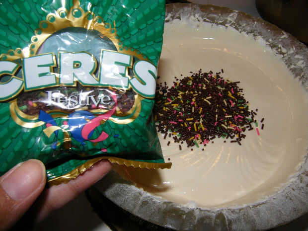arroz 2 cucharadas de chocolate (que no son exactamente granas/barretas, como los que están hechos de clara de huevo y azúcar. Arroz de chocolate están fabricadas de leche, el chocolate y la mantequilla, sobre todo conocido como hagelslag holandes, disponible en línea). Omitir si usted no puede encontrar. Puede usar chispitas regulares encontradas cualquier supermercado canadiense pero resultado/textura es un poco diferente).