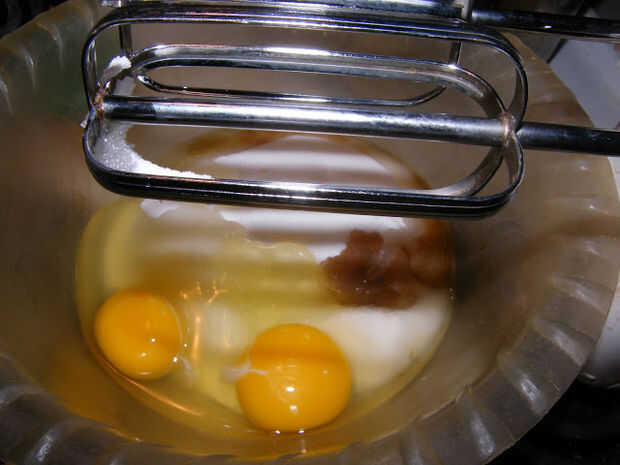 Bata los huevos, el azúcar y la esencia de vainilla hasta esponjosa y pálida
