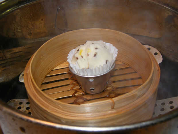 Llenar de trazador de líneas del cupcake con la mezcla 3/4 completo y luego de vapor durante 30 minutos, con tapa en la parte superior
