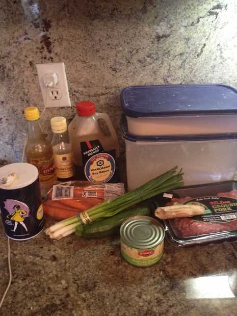 1/2 lb de carne de cerdo molido, 1 cebolla, 3 poblaciones de cebolla, 2 zanahorias, 1 lata de brotes de bambú, 1 calabacín, salsa de soja, vinagre de arroz, aceite de sésamo, ajo, pimienta negra, sal, azúcar, harina, levadura permite conseguir cocinar!