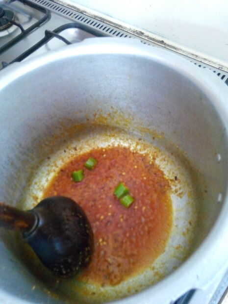 - agregar el Chile, cúrcuma, sal, zeera, cilantro seco. cocinar hasta que salga el aroma