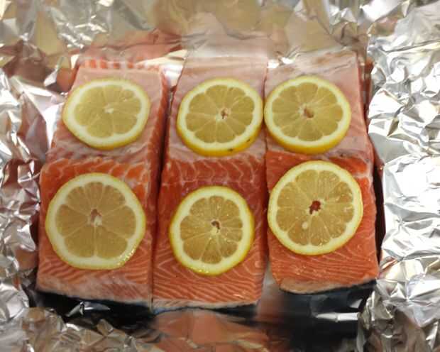 Cortar en secciones o filetes que están sobre un buen espesor medio y extienda en un generoso trozo de papel de aluminio. Me gusta cocinar con algunas rodajas de limón, pero no es necesario. Tengo un árbol de limón, así es bastante fácil.