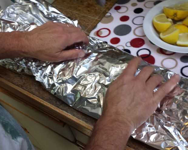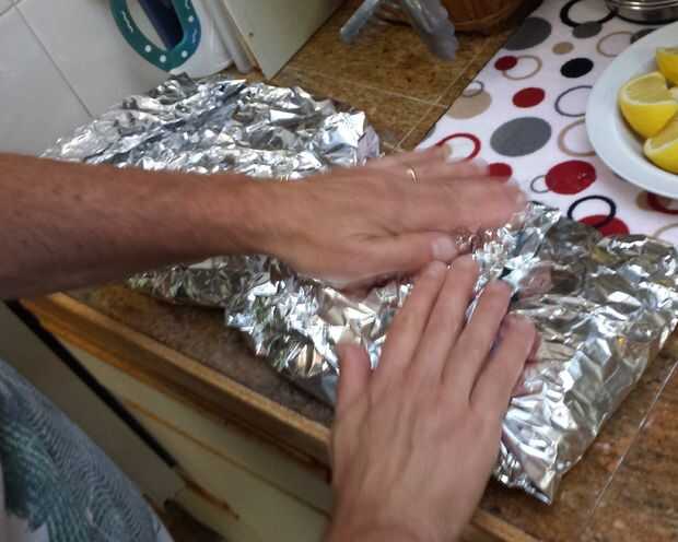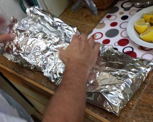 Me gusta doblar la hoja por lo que se superpone y selle el salmón, así que no gotee en el lugar y también se cocinan uniformemente. Deje la costura en la parte superior para que puedas comprobar en él cuando está casi listo.
