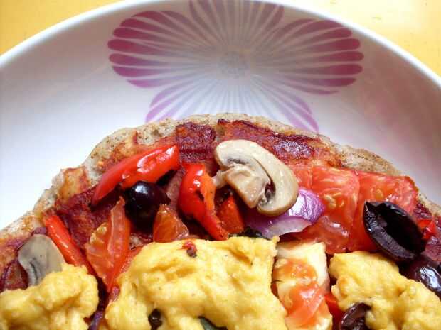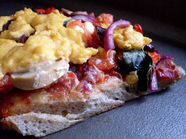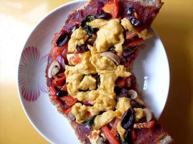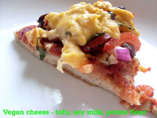Salsa de queso vegano (leche de soja, harina de tapioca, harina de patata, 3 cubos mezclados tofú, semillas de sésamo, 3 zanahorias y 3 cubos de tomate para color, condimentos. Mezcla todos los ingredientes finamente, cocinar durante 1 minuto a fuego medio hasta que espese. Disponer sobre la pizza y hornear)