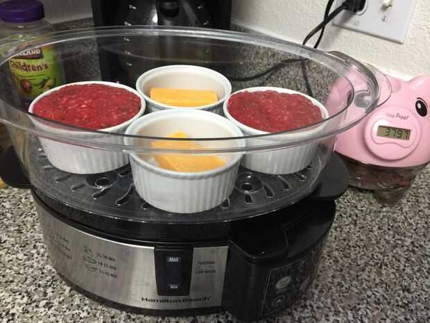 Nota: no vapor el queso durante más de 10 minutos, cocer por consiguiente como pueden añadirse más adelante en el proceso de cocción. Cuando cocine 4 hamburguesas, I mantener el queso en el segundo nivel y apilar en durante los últimos 10 minutos de cocción.