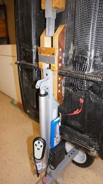 Aquí tenemos el punto de giro de la silla de montar de ala y el actuador lineal. Dentro del mecanismo telescópico vertical hay un resorte a gas (80 lb) que ayuda en la elevación vertical. Puede quitarse sin herramientas.