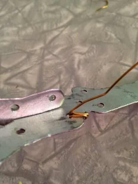 After drilling the holes. Intenté utilizar largos trozos de alambre tirando de ellos a través de los orificios con unos alicates. Poner una púa donde se cruzan los cables.