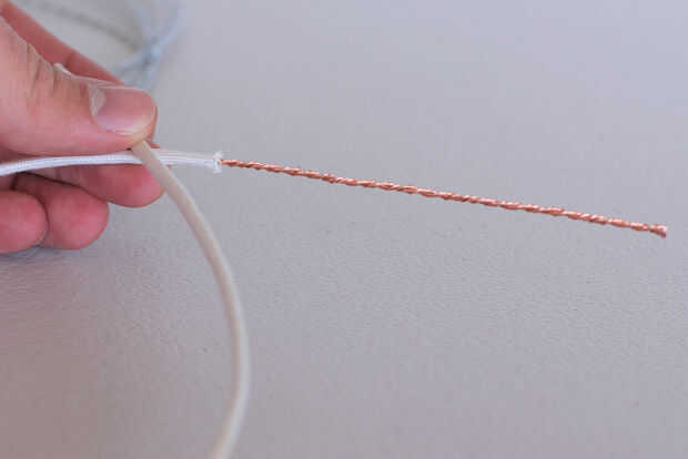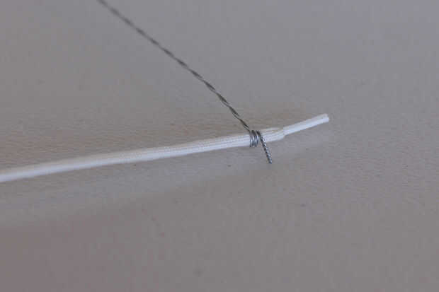 Cortar un extremo de los cordones de los zapatos e inserte el cable trenzado de cobre más grueso en el cordón hueco.