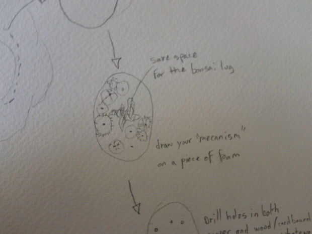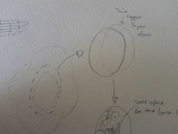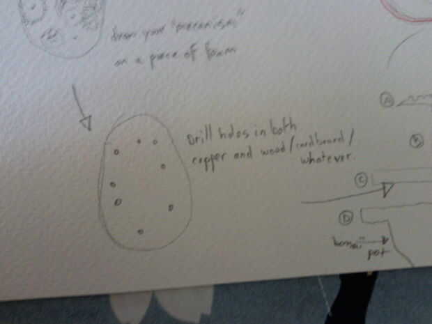 Cortar un trozo de madera en un tamaño más grande que su marco de fotos, pero no demasiado grande, 1cm más grande. Cortar un trozo de hoja de cobre del mismo tamaño y pégalo, lo hará su eje de engranajes ajuste más fuerte en todo. Ahora tome un pedazo de materia blanda, como espuma, dibujar la forma de su base, ahorrar espacio en el centro de su tronco bonsaï, taladre orificios (2 o 3) en su tronco y en la base, deben estar alineado, trate de hacer ambos al mismo tiempo. Agregado temporal el tronco en la espuma y el diseño de su mecanismo patern. Hacer una línea que representa el iner photoframe y no poner los engranajes sobre esa línea o no serás capaz de agregado todo junto. Colocar los engranajes como quieras, si el movimiento tiene un gran combo. Puede tener detalles con clavos de cobre, pequeños agujeros de taladro...