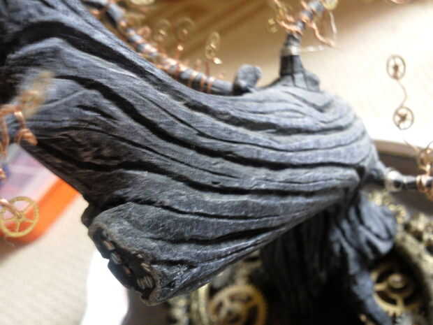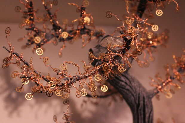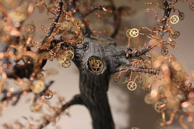 Tomar un engranaje de reloj, un alambre de cobre, doble el alambre por la mitad, poner el cable engranajes juntos y tuerza el alambre mientras olding el engranaje. Mantenga algunos recta alambre a agregado en la rama; hacer de diferente calibre, tenía aleatoriedad al follaje. Hacer esto, dependiendo de su follaje y llenan de su sector. Es más o menos, esta es la parte de paciencia pero vale la pena. Tenía detalles si lo desea, engranajes o tornillos pequeños