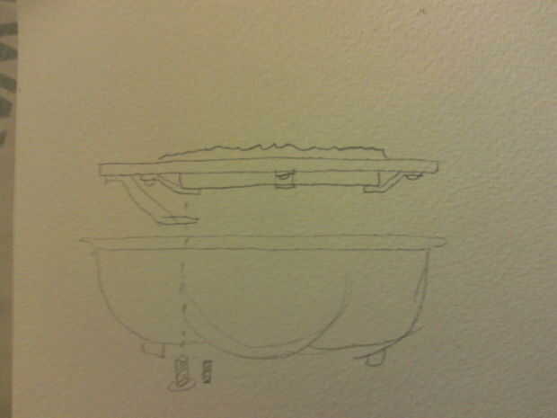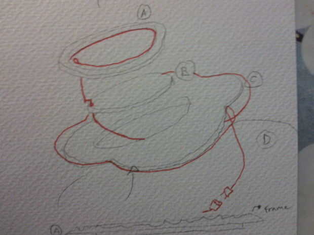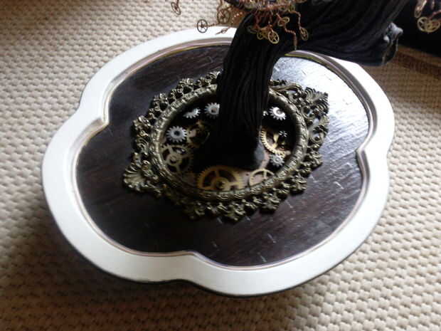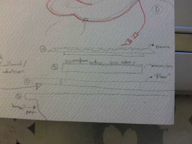 Con su maceta pintada, su piso hecho, tu marco pulido, su completo de cobre y engranajes, mecanismo realizado y engranajes bien atados, con los bonsais, bonsai es hora de terminar el trabajo. Hacer un sándwich como se muestra en el croquis. He hecho un mystake invertir así B y C, como el piso está entre el marco y mecanismo. ¡ No pegue nada, sin embargo, usted tendrá que poner su elwirre haciendo el sandwitch ^^.
