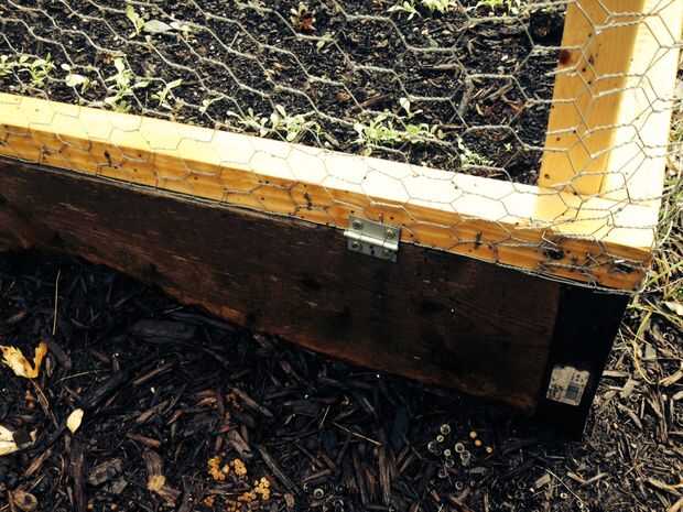 Para que sea más fácil acceder a los cultivos pongo bisagras en el extremo. Yo podría fijar una cuerda para limitar viajes a 95 grados. Estoy pensando en hacer un Pentágono mucho más alto con cinco segmentos ancho de 1 pie de habas y guisantes. Los tomates van a necesitar una jaula enorme.